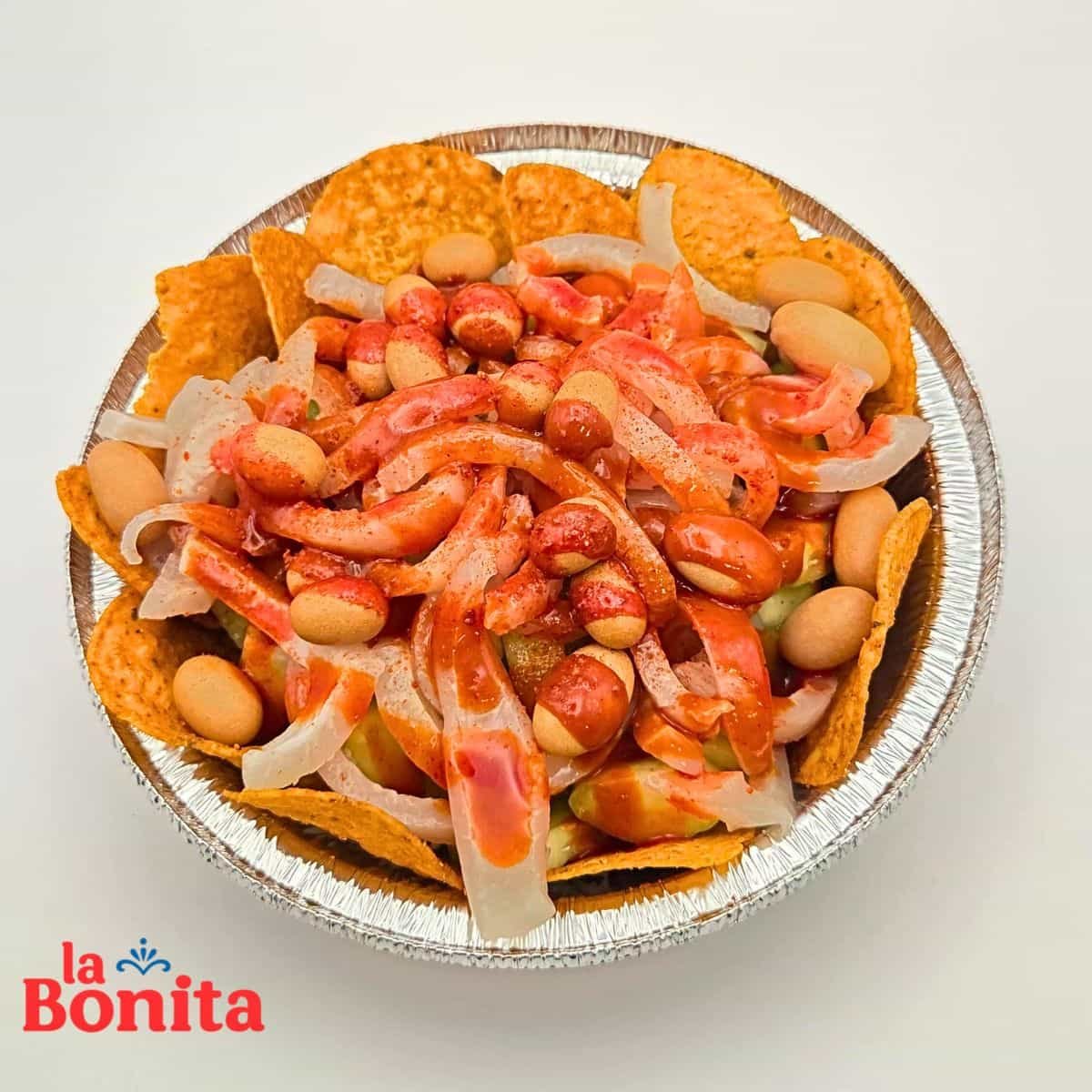 Loaded Tostitos with cueritos, peanuts, chamoy, lime, and more. Spicy, sweet, and addictive.